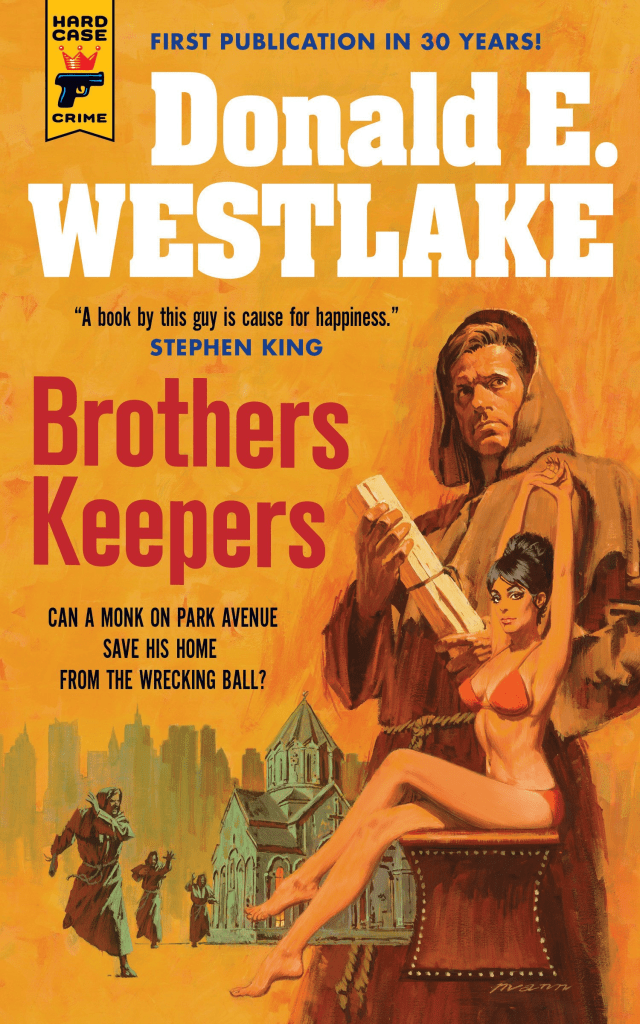 Hard Case’s 2019 reprint of his 1975 novel, Brothers Keepers, presented a rewarding example of the author’s range. Westlake described it as a crime novel sans crime and notes that it began as a story of “felonious monks” (his original working title) conceiving a robbery. Yet, the story went in another direction, as its creator fell in love with his central monk and moved him to an ordeal where redevelopers set sights on his centuries-old monastery, right in the middle of Manhattan. The monks fighting the removal show a micro community attached to an earlier time though they prove to be timeless outsiders, akin to Westlake’s cast company. Interacting with city life around them (and yes, the usual Westlake trip to the riches of Long Island occurs, with some more travel) offers a distinct treatment of built environment as it situates and molds the individual. Brothers’s new edition appeared in a series of varied novels by the author from Hard Case: Help I Am Being Held Prisoner, a prison tale; Forever and a Death, a James Bond that never came to be; Castle in the Air, a heist full of mishap; and the continually enjoyable Double Feature (a pair of tales of murderous movieland just as Westlake would see it). And Brothers will stand out the strongest in memory, and for this writer vying with The Cutie (Hard Case 2009; originally published in 1960 as The Mercenaries) as a favorite by Westlake.